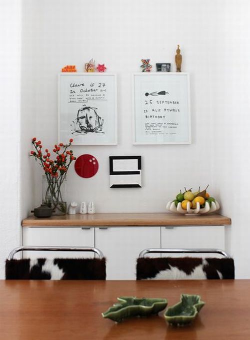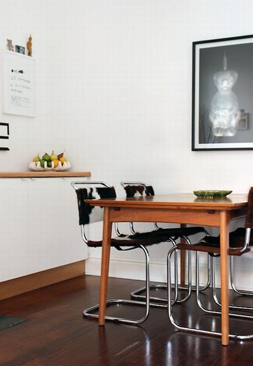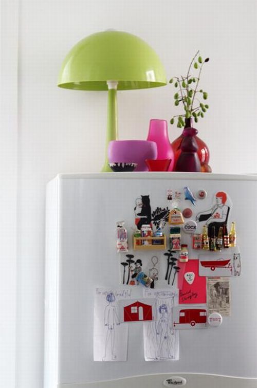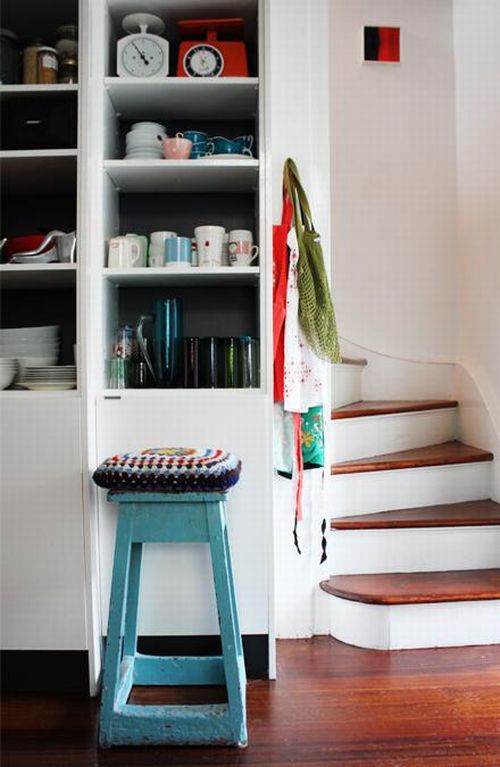 Az illusztrátor Kat Chadwick és a webdesigner Andrew Budge otthonát a Melbourne melletti Fitzroyban találjuk. Kitűnő példáját láthatjuk annak, hogy két alkotó és kreatív ember kis költségvetésből és a felhasználható alapterülettől függetlenül hogyan tud barátságos és ragyogó otthont teremteni. A főszerepet a kiegészítők, a dekorációs elemek kapják, melyekhez mind személyes élmények kapcsolódnak. Például ez a bőrszék, és ez a 70-es évekből származó szőnyeg melyet még Kat szülei vettek egy kiállításon. Sokmindent találtak használcikk piacokon, vagy az e-bay-en.